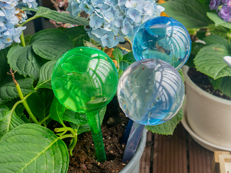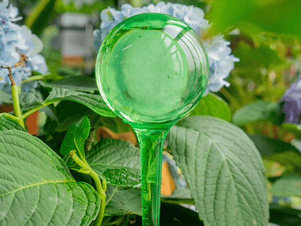 Bij de gesloten plastic bol zit het water in een afgesloten reservoir van 250 ml. De smalle steel steek je in de potgrond. Zodra de aarde droogt, ontstaat er onderdruk en stroomt er water uit de bol.
