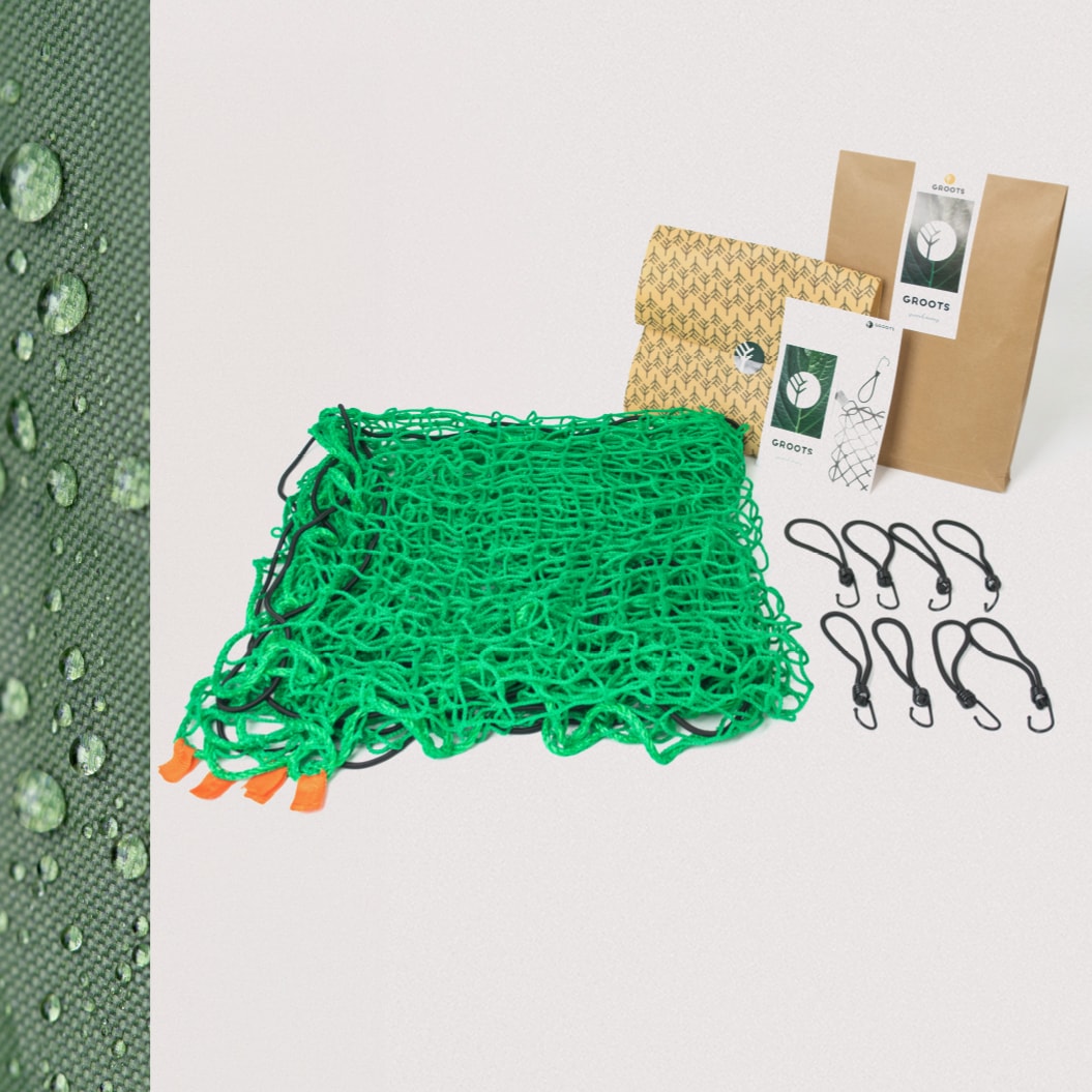 Het aanhangernet van Groots is gemaakt van duurzame, weerbestendige materialen die tegen een stootje kunnen. Het kan prima tegen regen en temperatuurschommelingen tijdens het transport. Echter, om de levensduur van het elastiek en het netmateriaal maximaal te verlengen, raden we aan om het net na gebruik droog op te bergen en niet permanent in de felle zon of vrieskou te laten liggen wanneer het niet in gebruik is. UV-straling kan op de lange termijn het elastiek aantasten, dus opbergen in een schuur of garage is altijd beter.